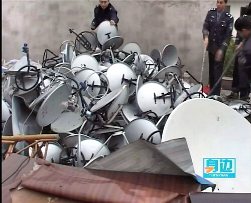 【同期声】临桂县广播电视局副局长 黄凌铭:“去年我们根据国务院129号令的第九条,对全县的地面卫星接受设施进行了清理,共收缴了非法安装的地面接收设施是268面,有效的净化了我县的卫星地面设施。”