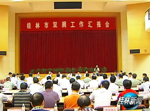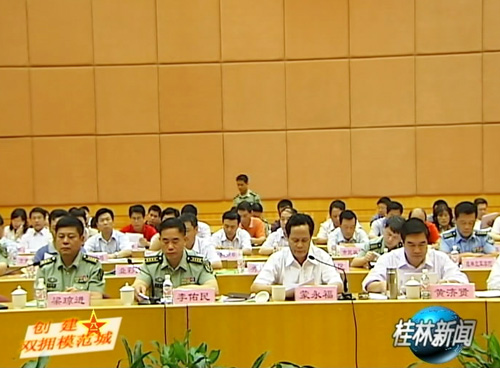 市委常委、政法委书记、市双拥工作领导小组副组长蒙永福就我市近几年来开展双拥工作情况进行汇报。蒙永福说,多年来,桂林始终坚持国防建设与经济建设协调发展,广泛开展双拥共建工作。在具体工作中,各级党委政府切实做到了凡是双拥工作,党政军领导亲自过问,凡是涉及军政军民关系的问题,党政军领导都要亲自抓;市政府出台了《桂林市拥军优属若干规定》,千方百计为部队转业干部、复退军人和军队离退休老干部解决生活和工作上和各种困难,维护了军队和军人的合法权益,使部队建设得到了稳定发展。另外桂林市每年坚持为部队立功官兵进行表彰奖励、每年的建军节、春节等节日,都到部队进行慰问,让部队官兵感受到了第二故乡的温暖,激发了部队官兵保家卫国的工作热情。通过抓双拥工作,有效地促进了全市精神文明建设和平安建设,促进了桂林市的经济建设和社会发展。