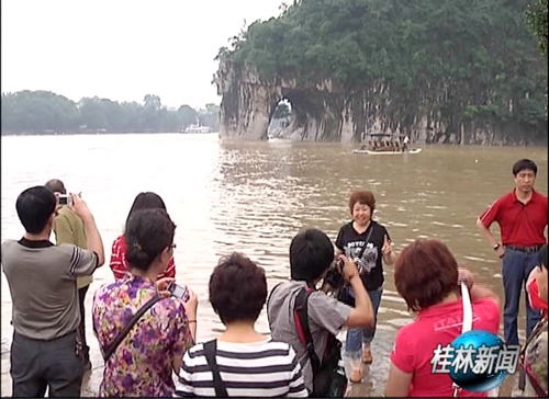 随着水位回落,象山、伏波山等沿江景区今天一大早就组织工作人员开展清淤消杀工作,第一时间恢复营业,磨盘山至阳朔的漓江全线游览今天恢复通航。