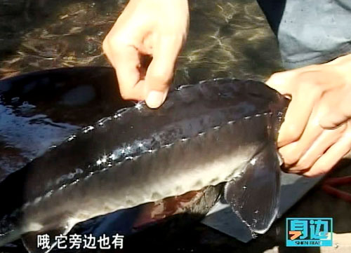 沿着华江乡同仁村委那条著名的红军路一直往上走,在一个被苍翠竹林掩映的半山腰记者看到了廖声佑的中华鲟养殖场。伴随着潺潺的流水声,几千尾中华鲟正在鱼池里欢快地游来游去。为了方便记者近距离观察,廖声佑捞起了一条中华鲟。这种鱼的身体近似于 纺锤形,有一个像老鼠一样尖尖的脑袋,背部和身体两侧有硬硬的白色突起,廖声佑介绍说,这是中华鲟的骨板。