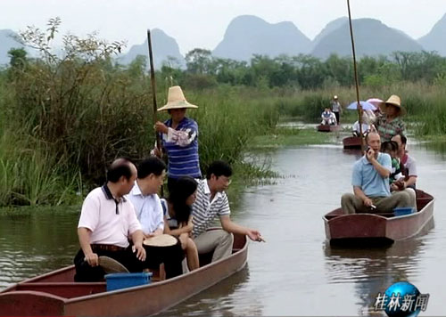 调研组实地察看了临桂县会仙湿地。近年来,市委、市政府高度重视生态建设,加强了对湿地资源的保护力度,并重点开展了对会仙湿地的保护工作。通过开展全市湿地资源调查,摸清了我市湿地资源基本情况;加强了对湿地资源的监管。 调研组对桂林市保护湿地的做法给予肯定。调研组希望桂林要继续加强对湿地资源的监管工作,制止当地群众对湿地资源的无序开发,保护湿地资源的周边环境不受到污染和破坏;按照“高起点、高标准”的规划设计要求,做好桂林会仙喀斯特国家湿地公园的总体规划编制工作,在保护中开发,在开发中保护;争取国家林业局资金、政策等多方面支持,建设好桂林会仙喀斯特国家湿地公园,使之成为桂林旅游发展的新亮点。