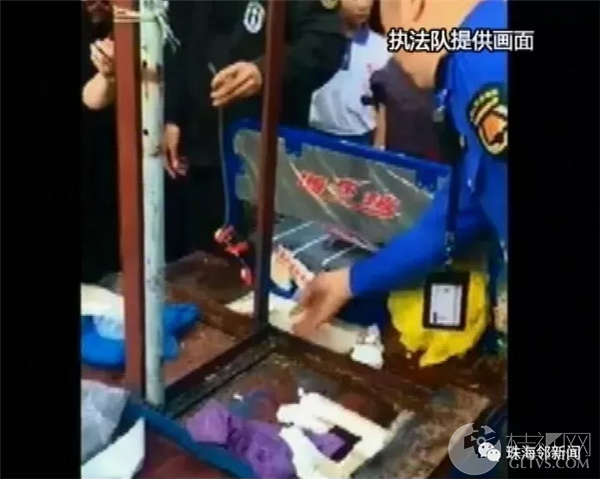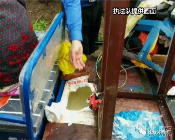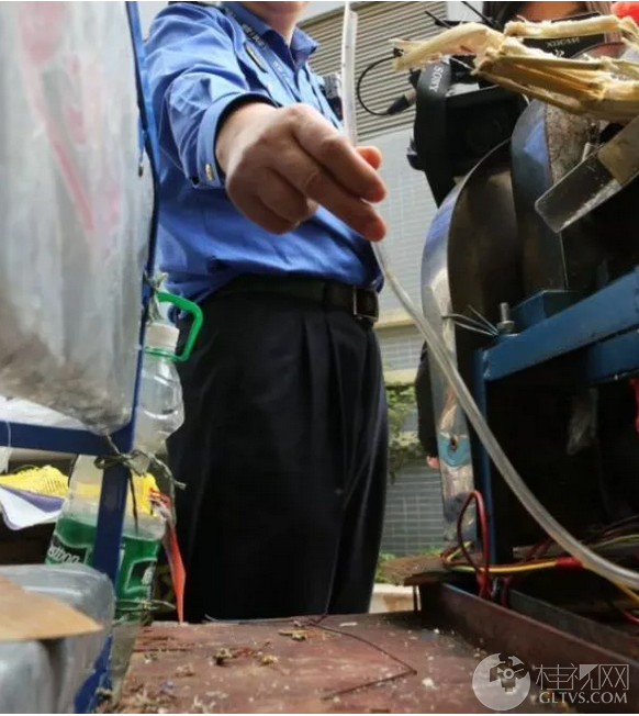执法人员将榨汁机下方的木板掀起后,发现下面暗藏了一个容量约20升的泡沫箱,里面装满了浑浊泛黄的液体,上面还漂浮着一些死虫!