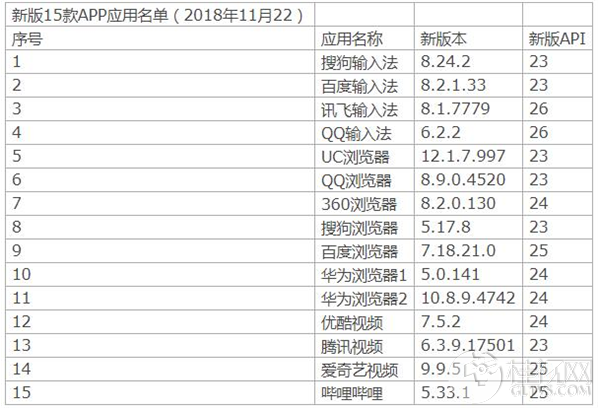 18款应用涉及的手机APP有:输入法(搜狗输入法、百度输入法、讯飞输入法、QQ输入法、触宝输入法);浏览器(UC浏览器、QQ浏览器、360浏览器、搜狗浏览器、猎豹浏览器、百度浏览器、华为浏览器1、华为浏览器2);综合视频(优酷视频、腾讯视频、爱奇艺视频、芒果TV、哔哩哔哩)。