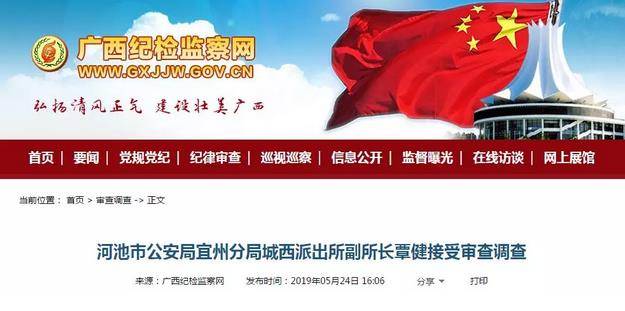 河池市公安局宜州分局城西派出所副所长覃健因涉嫌严重违纪违法,目前正在接受纪律审查和监察调查。