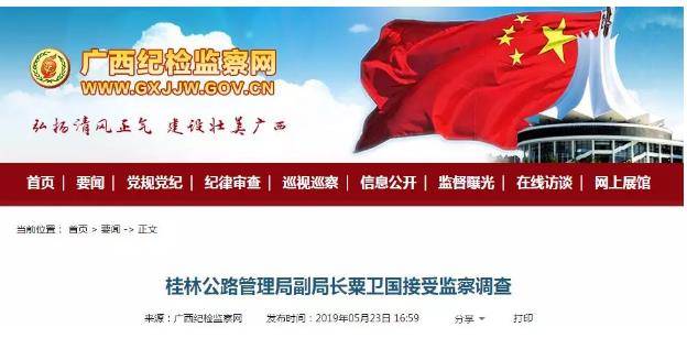 桂林公路管理局副局长粟卫国涉嫌违法,目前正在接受监察调查。