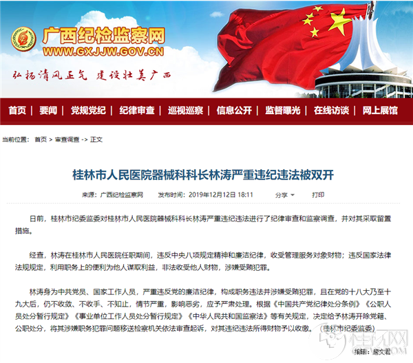 日前,桂林市纪委监委对桂林市人民医院器械科科长林涛严重违纪违法进行了纪律审查和监察调查,并对其采取留置措施。