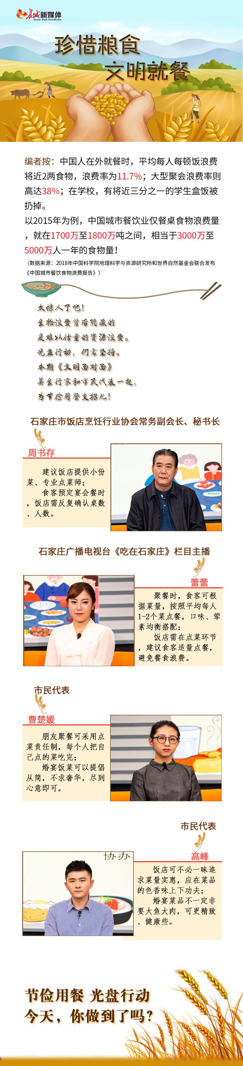 太惊人了吧!食物浪费背后隐藏的是难以估量的资源浪费。光盘行动,仍需坚持。本期《文明面对面》邀请了石家庄餐饮行业协会的常务副会长周书存、石家庄广播电视台经济广播《吃在石家庄》栏目主持人蕾蕾,以及两位市民代表,为节俭用餐支招儿!听听他们怎么说!