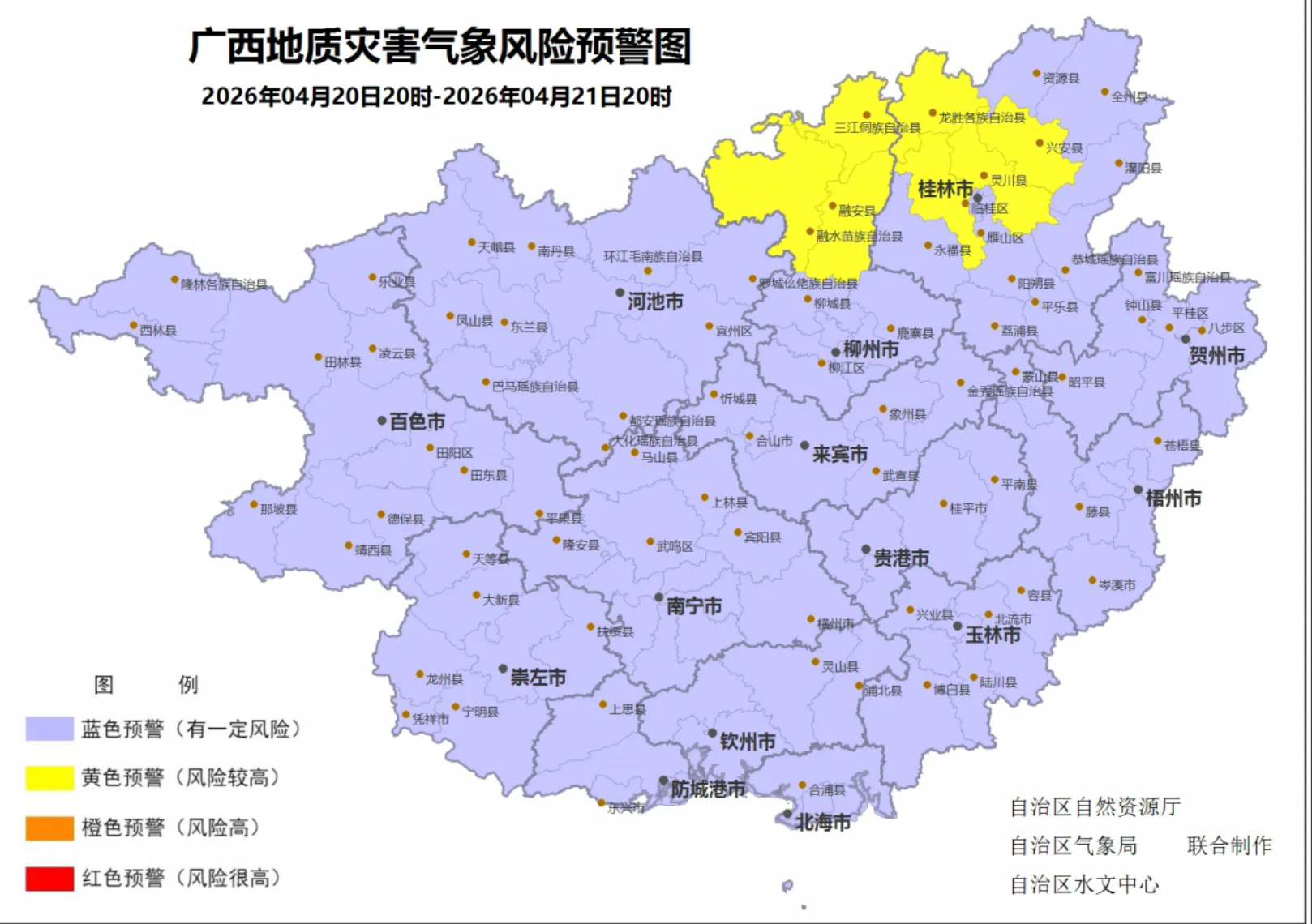 4月20日18时,自治区自然资源厅与自治区气象局、自治区水文中心联合发布地质灾害黄色预警:预报4月20日20时至4月21日20时,柳州市融安县、融水苗族自治县、三江侗族自治县,桂林市临桂区、灵川县、兴安县、龙胜各族自治县发生地质灾害的风险较高(黄色预警)。